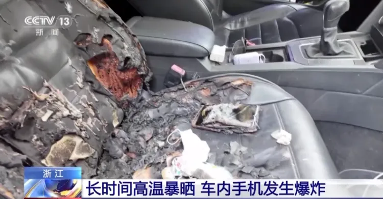 该车车头正对太阳,因当日气温较高,且在密闭的车内,温度远超室外;加之事发车辆未采取任何遮阳措施,致使车内温度急剧升高,进而引发手机爆炸。