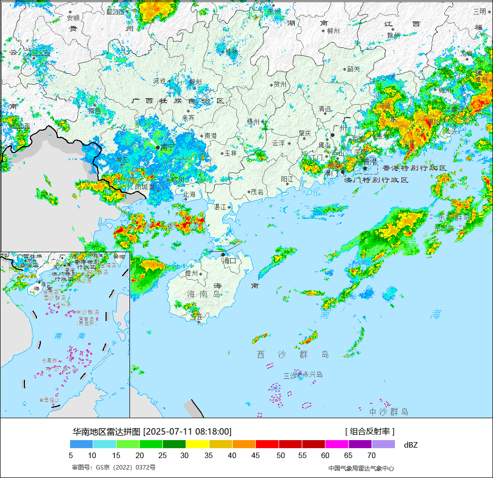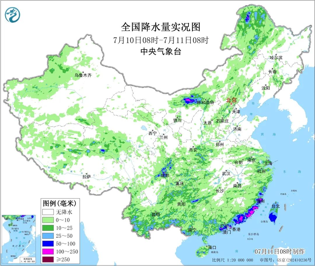 预计,7月11日8时至12日8时,福建东部沿海和南部、广东中南部、广西中南部、海南岛北部、台湾岛南部、云南中南部、四川盆地南部、江西南部、湖南南部、江苏南部、浙江北部、上海、内蒙古中部、黑龙江中部等地部分地区有大到暴雨,其中,广东东北部、福建东南部等地部分地区有大暴雨(100至150毫米)。上述部分地区伴有短时强降水(最大小时降雨量20至50毫米,局地可超过80毫米),局地有雷暴大风等强对流天气。中央气象台7月11日6时发布暴雨蓝色预警。