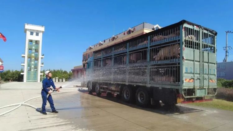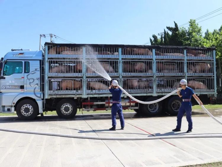 “能不能帮忙救救我的猪。”司机到来之前,东平消防救援站已接到总队预警,了解情况后立即组织消防员铺设水带,利用站前的室外消防栓连接水带迅速架设两把水枪,采用“细水雾”模式,持续、均匀地喷洒整个车厢及猪群身体。