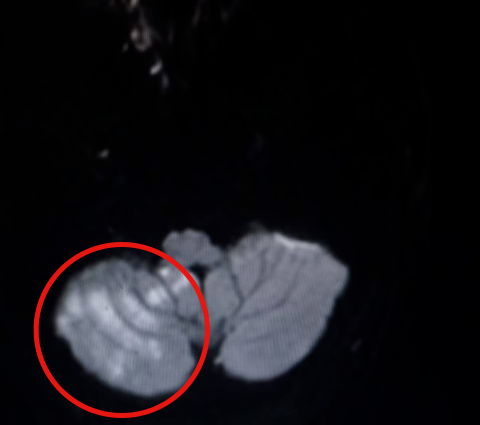 妻子慌忙拨打120,将他送到医院。医生发现,张先生除了眩晕、步态不稳,还伴有眼球震颤——这是典型的小脑受损症状。头颅MRI检查结果让人吃惊:右侧小脑大面积梗死。