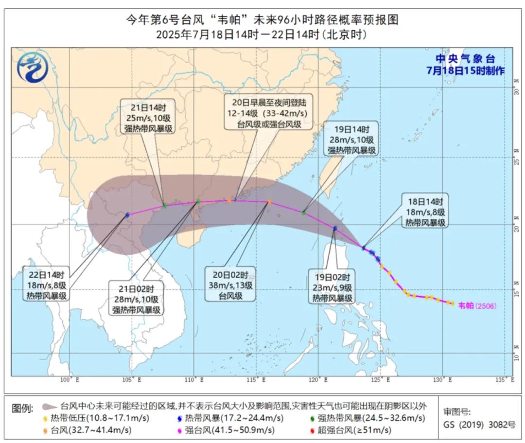 预计,“韦帕”将以每小时20~25公里左右的速度向西偏北方向移动,强度逐渐加强,最强可达台风级或强台风级(13~14级,38~42米/秒),19日凌晨至上午移入南海北部海面,尔后逐渐向广东中部至海南岛东部一带沿海靠近,将于20日至21日早晨在上述沿海登陆(台风级或强台风级),登陆后继续向偏西方向移动,强度逐渐减弱。