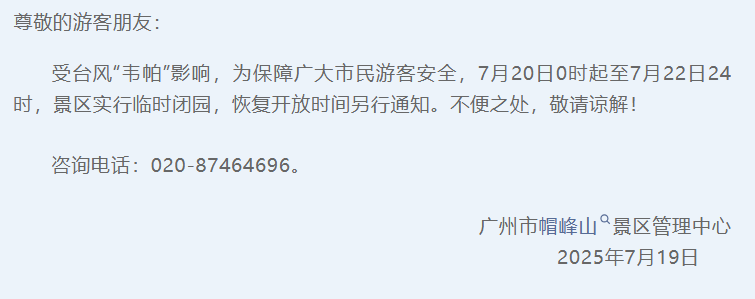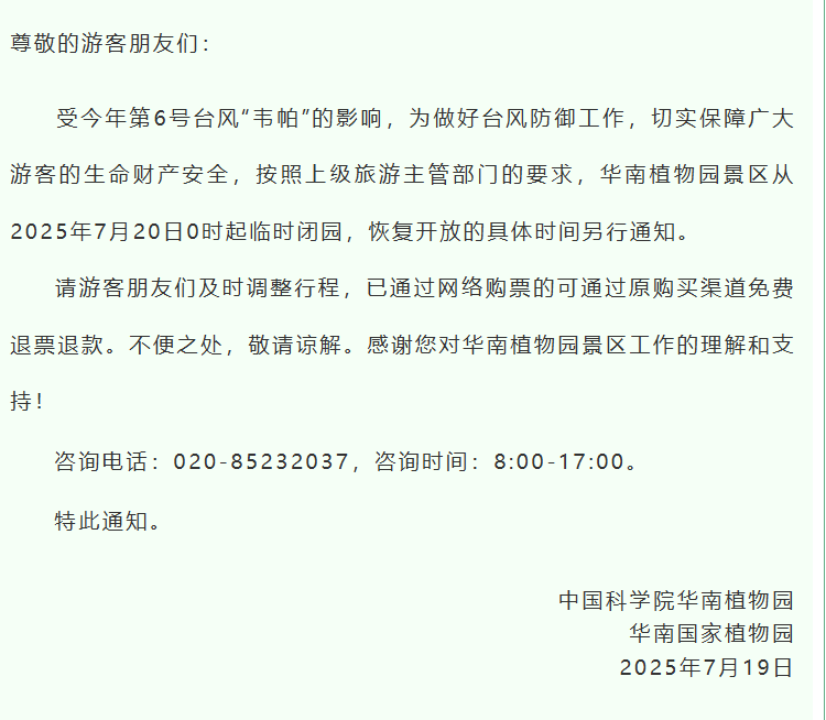 7月19日晚,华南植物园、帽峰山景区发布临时闭园通知。