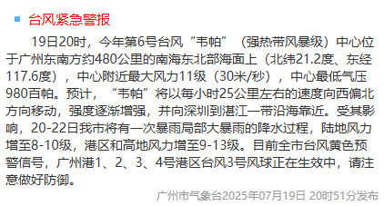 7月19日晚20时51分,广州市气象台发布台风紧急警报。受台风“韦帕”影响,20-22日广州市将有一次暴雨局部大暴雨的降水过程,陆地风力增至8-10级,港区和高地风力增至9-13级。