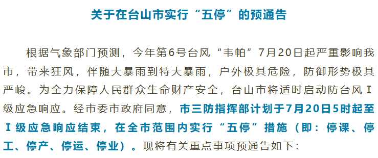 7月19日晚,台山发布《关于在台山市实行“五停”的预通告 》,通告中提到:市三防指挥部计划于7月20日5时起至Ⅰ级应急响应结束,在全市范围内实行“五停”措施(即:停课、停工、停产、停运、停业)。