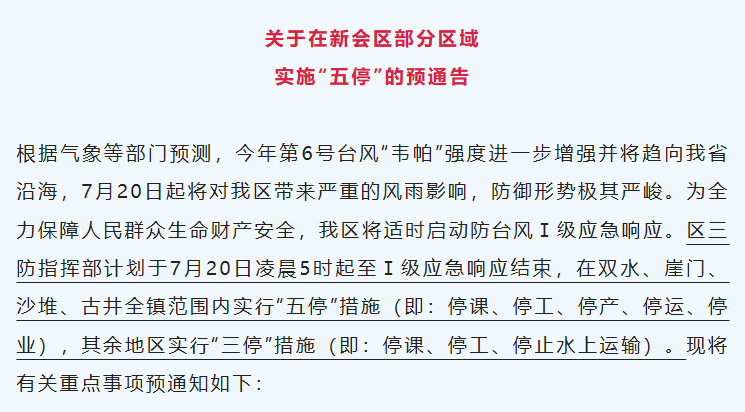 7月19日晚,新会发布《关于在新会区部分区域实施“五停”的预通告》,通告中提到:区三防指挥部计划于7月20日凌晨5时起至I级应急响应结束,在双水、崖门、沙堆、古井全镇范围内实行“五停”措施(即:停课、停工、停产、停运、停业),其余地区实行“三停”措施(即:停课、停工、停止水上运输)。