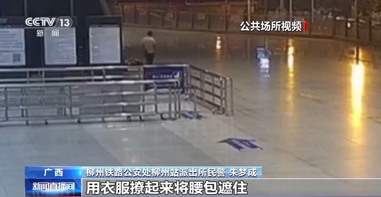 柳州铁路公安处柳州站派出所民警 朱梦成:根据周先生的描述,我们发现周先生在熟睡时,有一名身穿白衣的男子来到他身边,用工具将腰包背带割断,将腰包迅速放在自己后腰带内,用衣服撩起来将腰包遮住,迅速逃离现场。