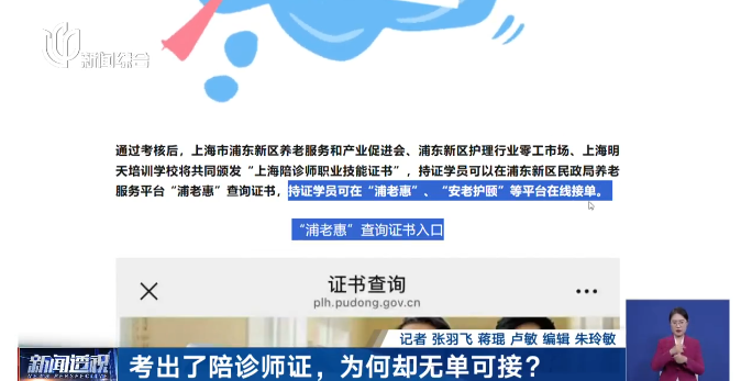 业内专家表示,民间的陪诊需求其实很可观。但现在,各区甚至不同培训机构的接单平台并未打通,各平台还要优先满足养老机构驻点陪诊师的接单,考证的频次和体量又过高,导致了自费考证的陪诊师们无单可接。