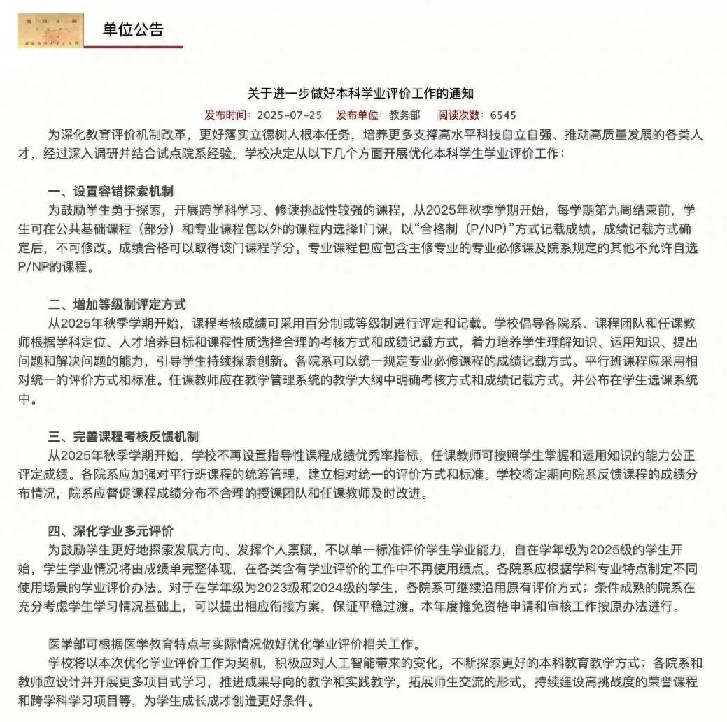 北大的改革并非孤例。早在2015年,清华大学就率先以12档等级制取代GPA评价,强调多元评价体系,直指“GPA导向的学业成就观”问题;2019年清华进一步完善制度,减少分数对学生的捆绑。近年来,复旦大学、上海交通大学等985高校也陆续调整评价体系,或取消绩点排名,或推行“等级制+综合评价”模式。这些改革共同指向一个目标:打破“唯绩点论”,让教育回归本质。