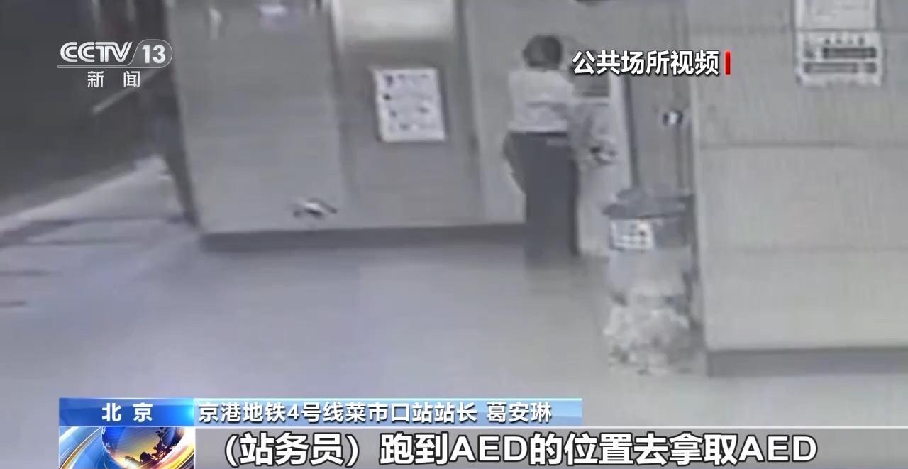 京港地铁4号线菜市口站站长 葛安琳:站务员跑到AED的位置去拿取AED,回到现场后,她又把AED交给一位热心乘客进行接力。我们的站务员同时取来围栏,在现场圈出一个急救区域。