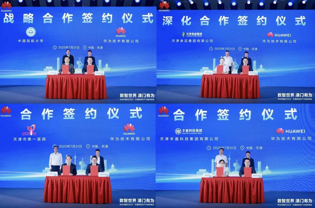 峰会签约环节成为政企协同、产教融合的重要见证。华为技术有限公司分别与中国民航大学、天津市食品集团有限公司、天津市第一医院、天津丰盈科技集团有限公司达成战略合作,天津市科技局、国资委、投促局、河北区等部门领导共同见证签约。此次系列签约是多方深化产业联动的重要举措,旨在推动产学研深度融合与数字化转型。