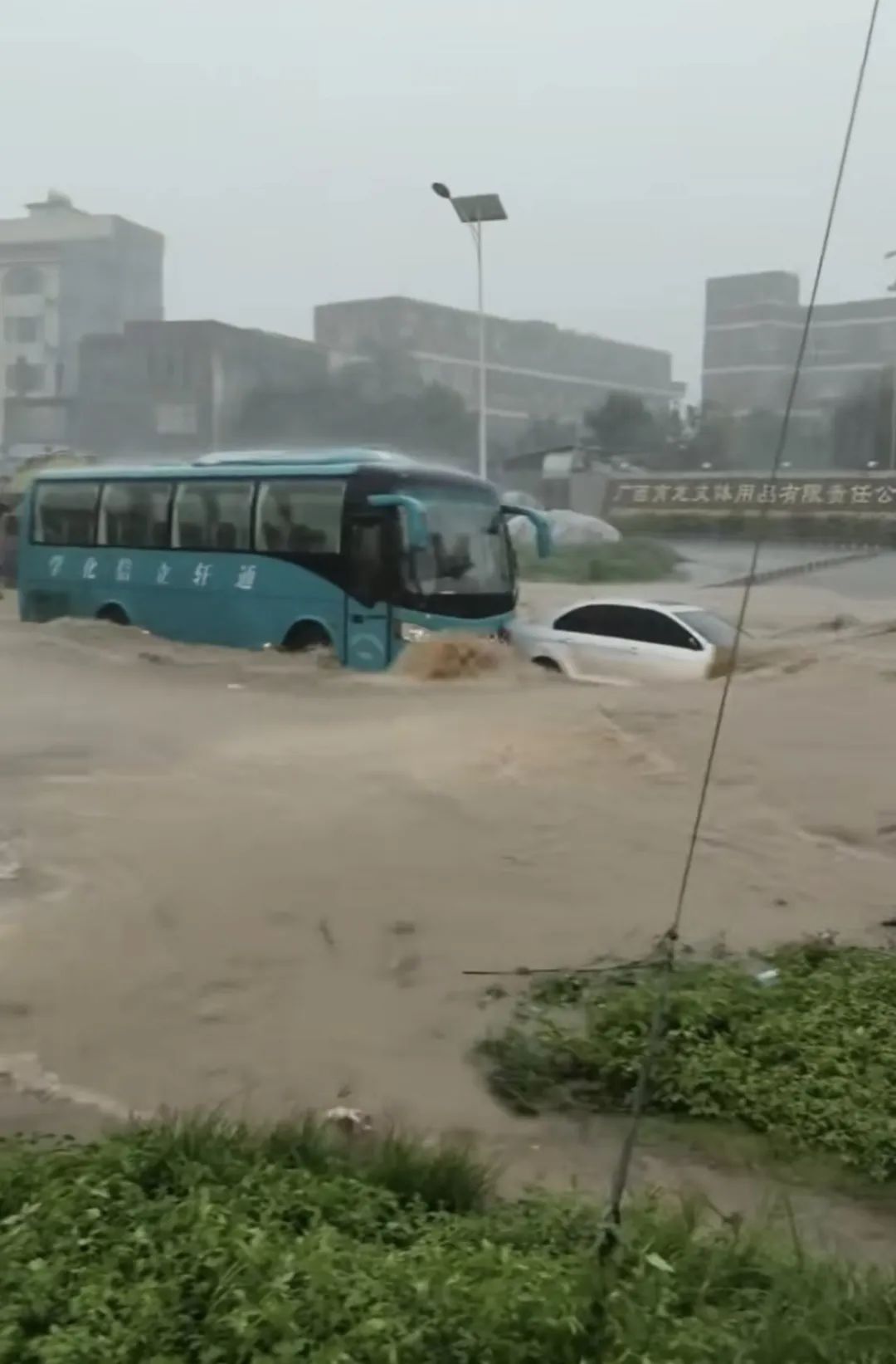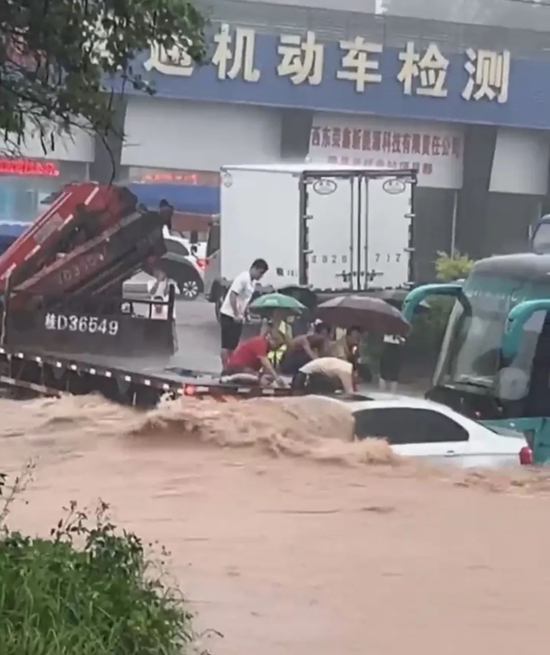 8月4日下午5时许,梧州藤县遭遇持续强降雨,鑫通机动车检测站附近路段积水迅速上涨。一辆白色小轿车途经此处时,被洪水淹没大半,水流瞬间涌入车内,车内3人陷入险境。危急时刻,检测站员工吴绪乾、李发志等人与热心市民挺身而出,上演了一场惊心动魄的生死救援。