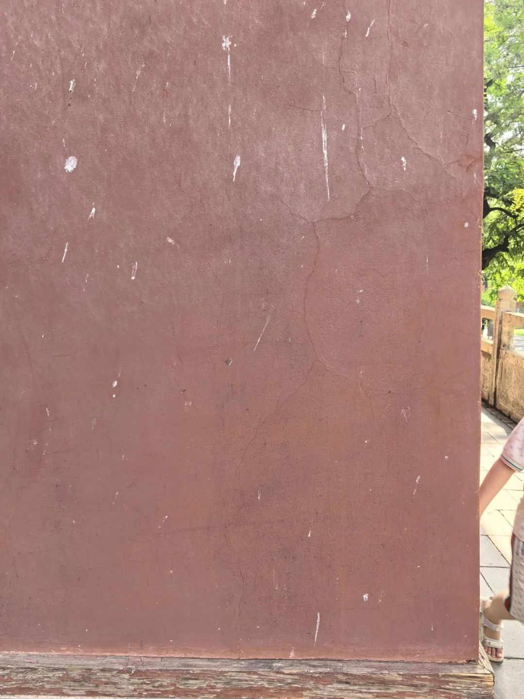 薄伽教藏殿作为辽代木构珍品,其墙体因古建筑特有的收分结构,易在立面自然积存浮尘。此次痕迹仅为表层浮尘被擦拭后形成的短暂印记,未对殿外墙体的涂料层造成任何损伤,无需干预修复。