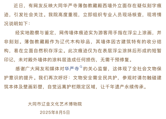 说明称,经实地勘察与鉴定,网传墙体痕迹实为游客用手指拭去浮尘所致,并非刻划。