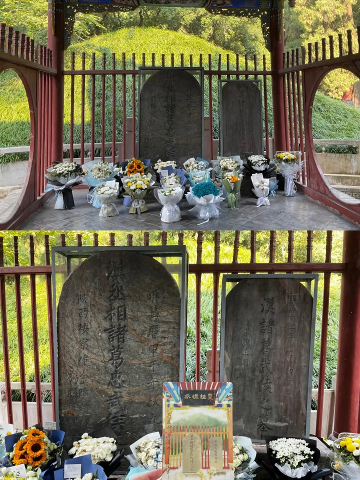 在武侯祠的诸葛亮墓前摆放西安的泥土;