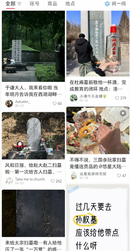 无论是传统的烧香敬酒,还是现在“创新”的药品、手写信、车票等等,人们对古人的追思和缅怀都是一样的。但是年轻人更甘愿耗费心神制作礼物,长途跋涉抵达墓前。“标新立异”是因为人们不再局限于史书上的寥寥几笔,而是向往到墓前完成一场“见面和交流”。