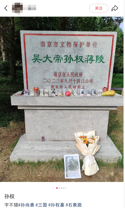 网友“花式扫墓”也是脑洞大开,有人给刘备送去7张诸葛亮的《三国杀》卡牌外加一个孙尚香;给孙权送去了各种形象的张辽立牌,还有他最喜欢吃的柑橘;霍去病墓前放了许多零食、奶茶......