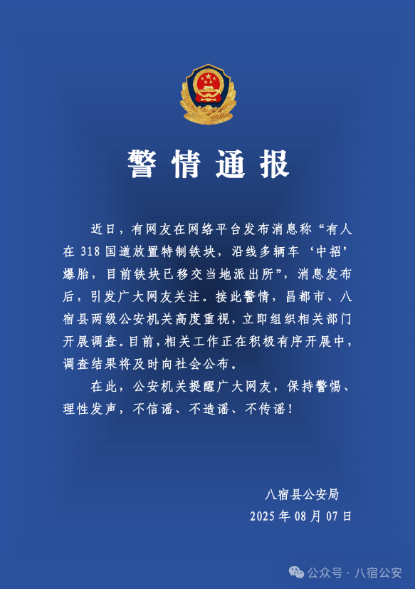 近日,有网友在网络平台发布消息称“有人在318国道放置特制铁块,沿线多辆车‘中招’爆胎,目前铁块已移交当地派出所”,消息发布后,引发广大网友关注。接此警情,昌都市、八宿县两级公安机关高度重视,立即组织相关部门开展调查。目前,相关工作正在积极有序开展中,调查结果将及时向社会公布。