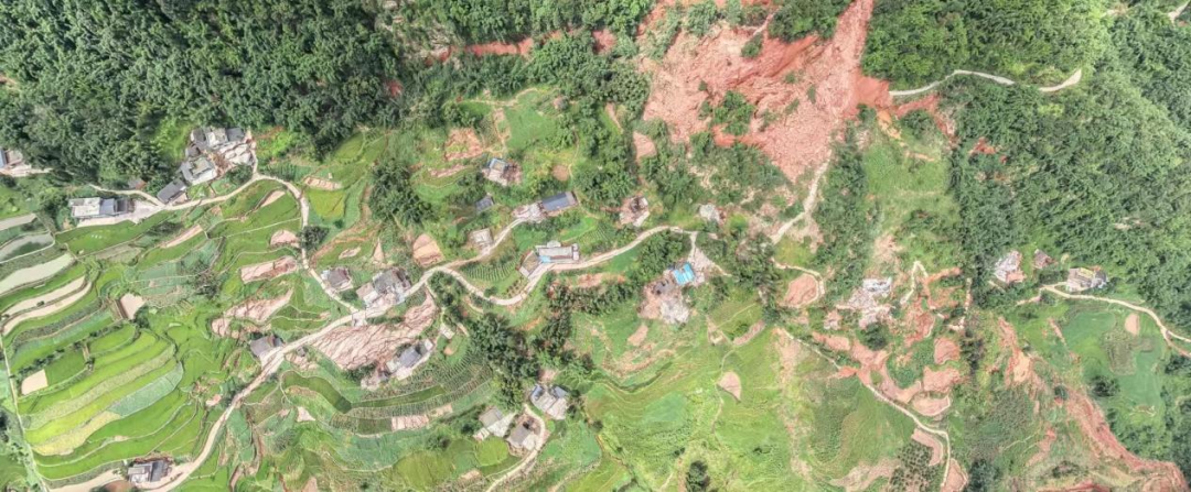 滑坡发生后,杨胜录通过无人机传回的图像看到了自家房屋状况:两层砖房已完全倒塌,附近路面断裂严重,田地里的庄稼被掩埋、冲毁。