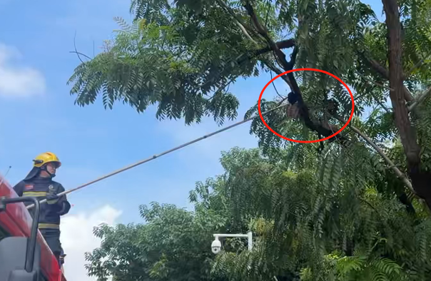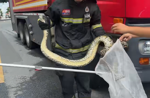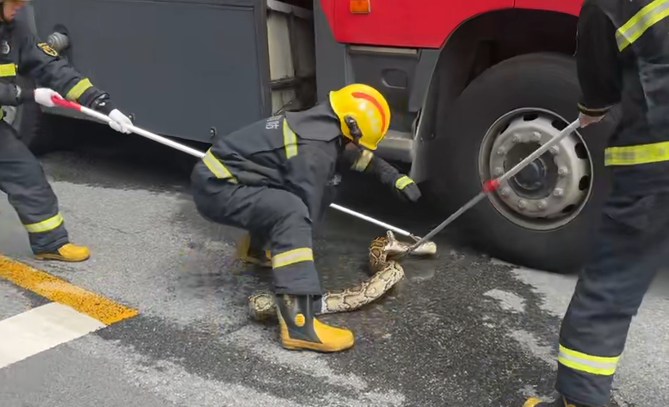 被抓住的蛇向消防员张开大口。图源:佛山消防
