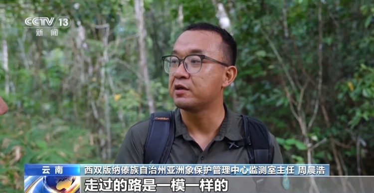 西双版纳傣族自治州亚洲象保护管理中心监测室主任 周晨浩:亚洲象嗅觉、听觉都特别灵敏,我发现“阿宝”走的那条路和“然然家族”10分钟、20分钟前走过的路是一模一样的。