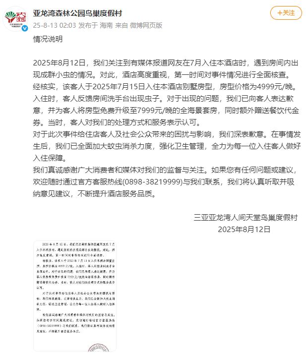 2025年8月12日,我们关注到有媒体报道网友在7月入住本酒店时,遇到房间内出现成群小虫的情况。对此,酒店高度重视,第一时间对事件情况进行全面核查。