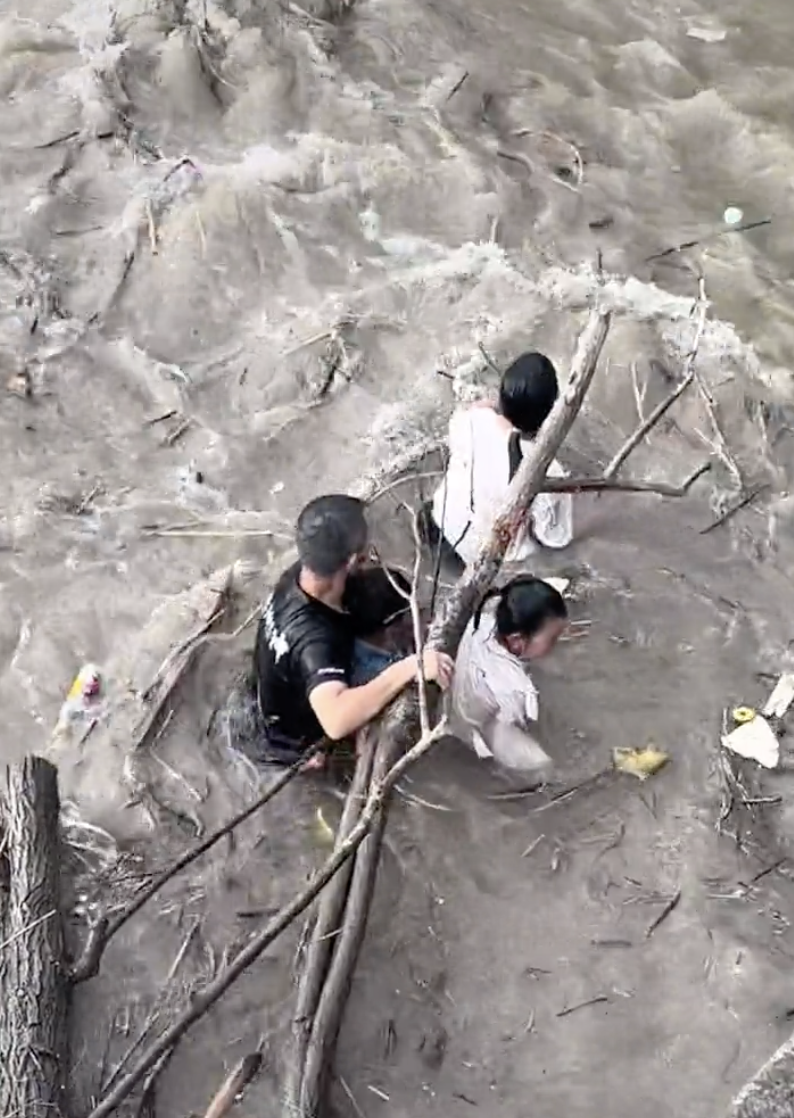▲视频截图 4人抓住水中树枝