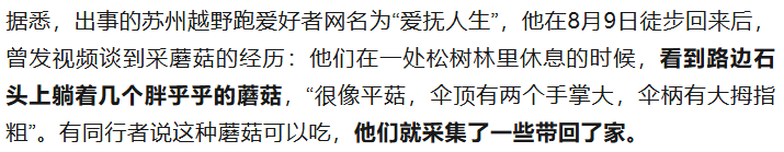 据知情人士14日透露,“爱抚人生”在8月9日和朋友去苏州旺山徒步,途中发现了一些野生蘑菇,就采回家当天中午吃了。之后发现身体不舒服,下午到当地一家小医院挂了水,发现没有效果,后来又去大医院就诊。