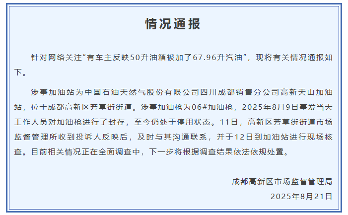 涉事加油站为中国石油天然气股份有限公司四川成都销售分公司高新天山加油站,位于成都高新区芳草街街道。涉事加油枪为06#加油枪,2025年8月9日事发当天工作人员对加油枪进行了封存,至今仍处于停用状态。11日,高新区芳草街街道市场监督管理所收到投诉人反映后,及时与其沟通联系,并于12日到加油站进行现场核查。目前相关情况正在全面调查中,下一步将根据调查结果依法依规处置。