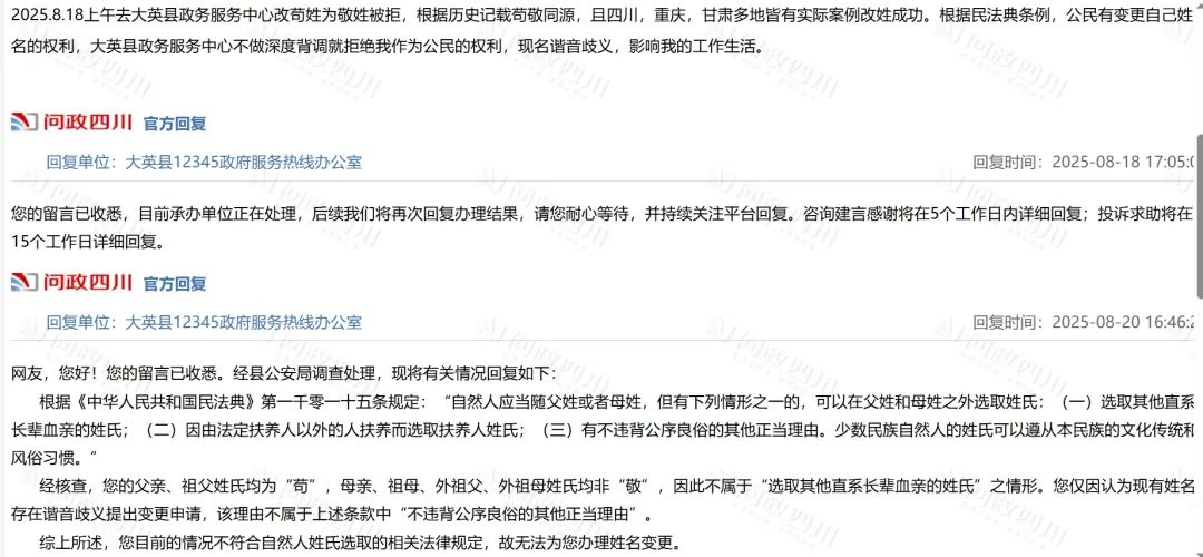 8月22日,记者致电大英县公安局,工作人员介绍,关于该市民申请改姓的相关情况已向当事人作出了详细解释,由于该市民直系长辈均无“敬”姓,无法定改姓理由,仅是谐音歧义不属于“不违背公序良俗的其他正当理由”。