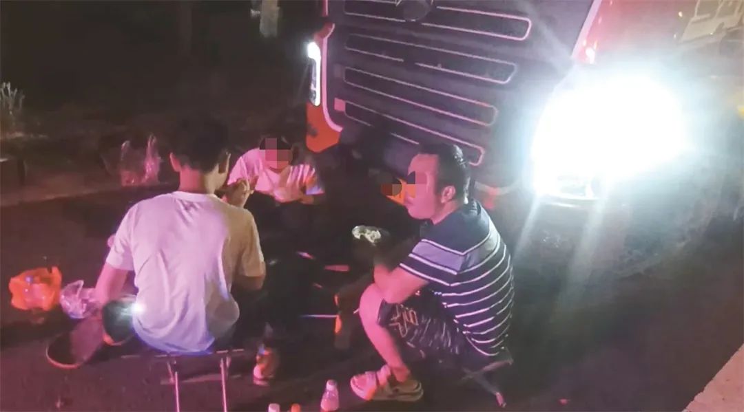 民警迅速上前查看,发现车头旁边竟支起了一个临时“移动厨房”,驾驶员和两名随车人员正围坐在一起吃饭,全然不顾周围呼啸而过的车辆和潜在的危险。