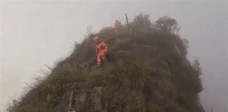 浓雾如墙,夜色如墨,在能见度极低的极端环境下,搜救组谨慎前行,抵达被困人员所在位置。然而,晚间异常崎岖湿滑的地形(以流纹岩为主,土壤层薄、峭壁林立)和几乎为零的能见度,直接移动风险巨大。救援人员立即为父女俩补充了水分和食物,待其稍作恢复后,由一名经验丰富的队员在前探路,一人在后护持,众人沿着湿滑嶙峋的岩壁,时刻留意脚下路况,不断提醒父女俩“踩稳脚下”“抓牢身边树枝”,遇到陡峭路段,更是直接伸手搀扶,一步一步地将他们护送至安全地带。