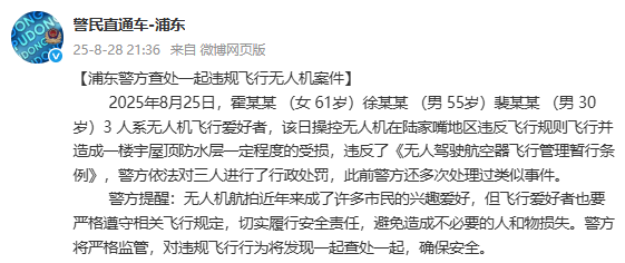 2025年8月25日,霍某某 (女 61岁)、徐某某 (男 55岁)、裴某某 (男 30岁)3人系无人机飞行爱好者,该日操控无人机在陆家嘴地区违反飞行规则飞行并造成一楼宇屋顶防水层一定程度的受损,违反了《无人驾驶航空器飞行管理暂行条例》,警方依法对三人进行了行政处罚,此前警方还多次处理过类似事件。