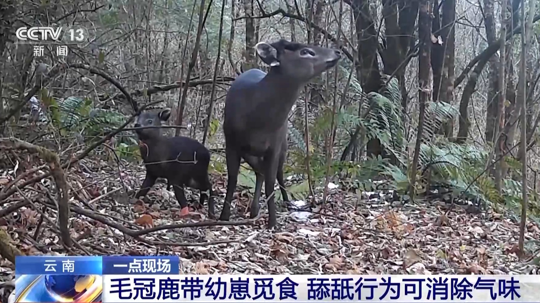 近日,云南高黎贡山国家级自然保护区在怒江段布控的红外相机,捕捉到了国家二级保护动物毛冠鹿带崽觅食的影像。