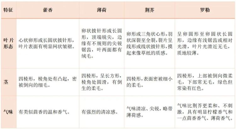 看到这里,你心动了吗?其实像藿香这类的特色植物很多,例如薄荷、荆芥、罗勒等。有不少人把这几种调料弄混了,可以参考以下表格进行辨别。