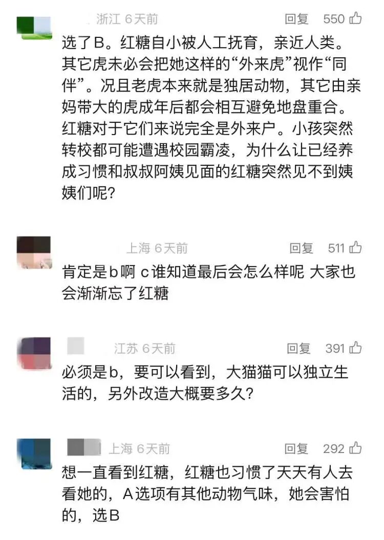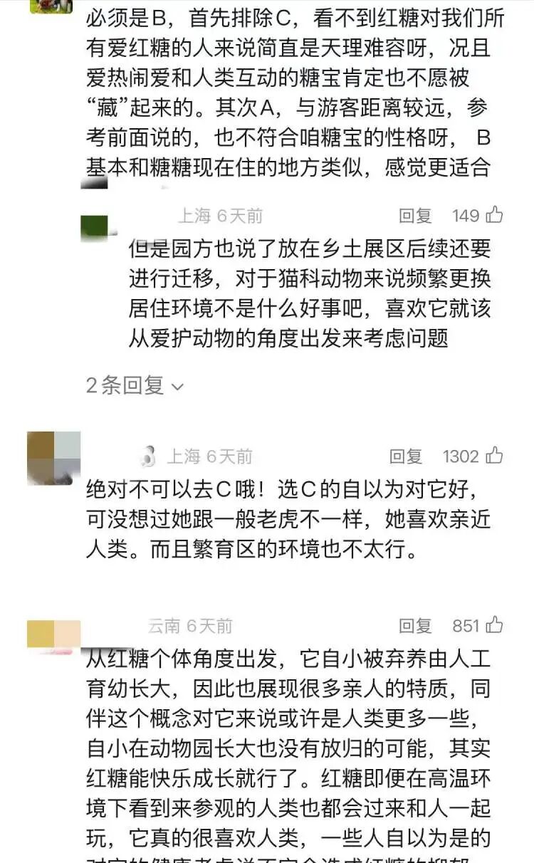 有粉丝选择第一个方案,认为狮虎山面积够大,有利于“红糖”活动,虽然要忍受不能天天见到“红糖”的“相思之苦”,但为了“红糖”好,选择接受。这部分游客认为,方案二的展区太小,方案三完全不能接受,因为再也见不到“红糖”了。有粉丝不同意这个方案,认为狮虎山有其他动物的气味,“红糖”会害怕。