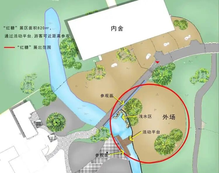 狮虎山中的非洲狮展区面积为400平方米,配备水池、栖架及多种玩具等丰容设施,“红糖”可以在那里长期居住,但得与非洲狮轮流展出,每周能展示4天。游客参观道有大树遮阴,参观面有壕沟与“红糖”隔离,因此,游客与动物之间的距离较远。