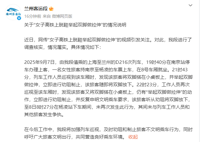 2025年9月7日,由我段值乘的上海至兰州的D216次列车,19时40分在南京站停车办理上客,一名女性旅客持南京至杨凌的车票上车,在8号车厢就坐。21时43分,列车工作人员巡视到该车厢时,发现该旅客将双脚搭在小桌板上,并举起双脚做拉伸,立即进行劝阻制止,该旅客随即将双脚放下。22时23分,工作人员再次巡视至该车厢时,发现该旅客又将双脚搭在小桌板上,仍有“举起双脚做拉伸”的动作,立即进行劝阻制止,并反复申明文明乘车要求,该旅客听从劝阻将双脚放下,至8日8时27分在杨凌站下车期间,未再次发生此行为,其间未与列车工作人员和其他旅客发生争执。