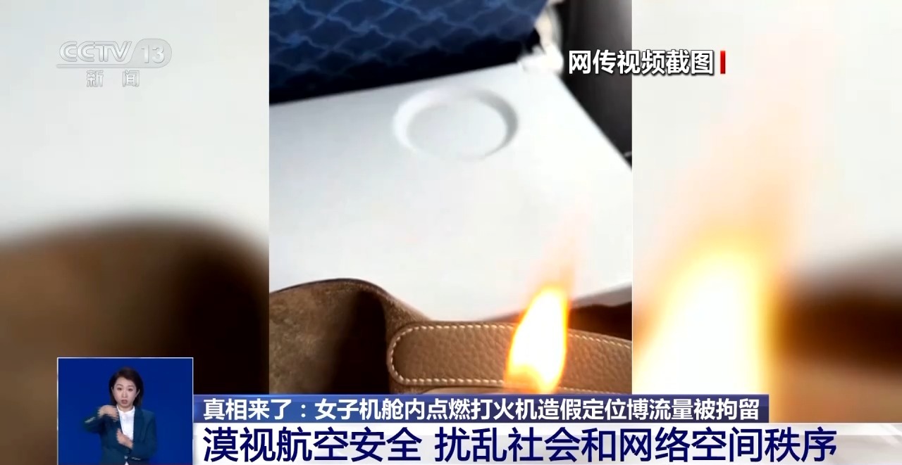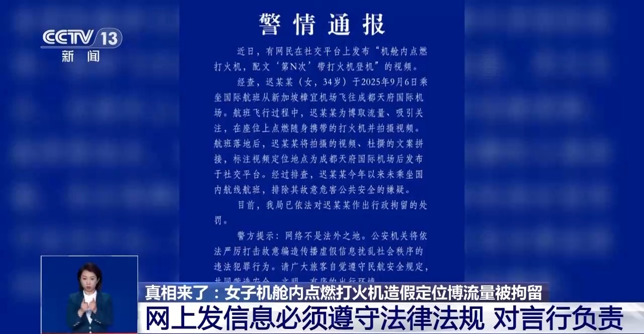 中央网信办举报中心今天(9日)辟谣发布,四川省公安厅机场公安局发布的警情通报显示,经查,迟某某(女,34岁)于2025年9月6日乘坐国际航班从新加坡樟宜机场飞往成都天府国际机场。航班飞行过程中,迟某某为博取流量、吸引关注,在座位上点燃随身携带的打火机并拍摄视频。
