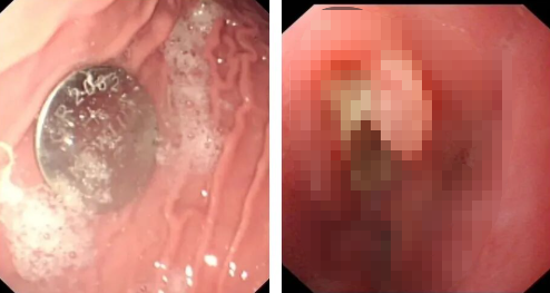纽扣电池被误吞卡在食道后,就像启动了一个“微型电烙铁”。电池正负极会通过湿润的人体组织形成电流,并泄漏强碱性液体,造成化学烧伤、电烧伤等多重打击。