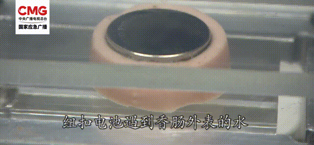 为直观模拟纽扣电池的破坏性,实验人员将一枚纽扣电池放在香肠上,电池遇到香肠里的水分,发生电解并产生碱性液体,很快香肠表面就被严重腐蚀。图源:国家应急广播
