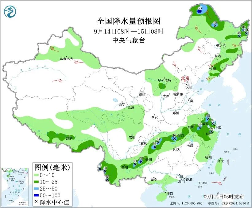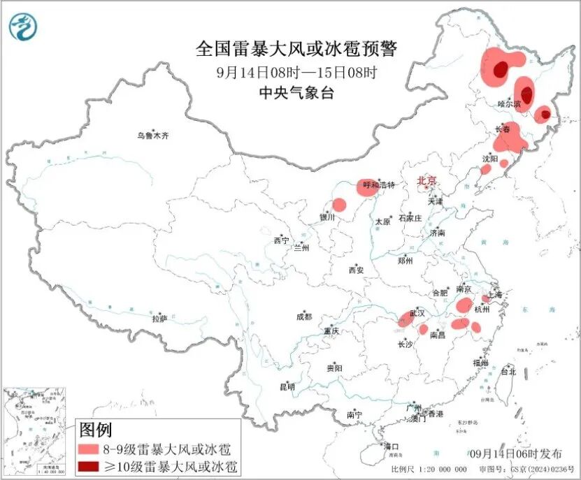 中央气象台9月14日06时继续发布强对流天气蓝色预警:预计9月14日08时至15日08时,内蒙古中西部、东北地区、江南北部等地的部分地区将有8级以上雷暴大风或冰雹天气,其中,黑龙江中部和东南部等地的部分地区将有10级以上雷暴大风;东北地区、华北西北部、江南北部、西南地区东部和西南部等地的部分地区将有小时雨量大于20毫米的短时强降水天气,其中,重庆东南部、贵州西南部等地的部分地区小时雨量大于50毫米,最大可达60毫米以上。预计,强对流的主要影响时段为今天白天。