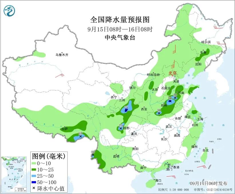 今明两天(9月14日至15日),南方降雨逐步缩减,较强降雨主要出现在西南部分地区。后天,黄淮到四川盆地一带新一轮降水过程发展,需注意防范降雨可能引发的次生灾害。气温方面,未来几天,南方高温先增多后减少,北方多地气温将创下半年来新低,秋凉渐显。