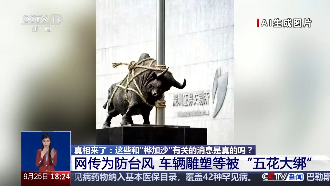 同一天,其他网民传播的图片显示,深交所门前的牛雕塑也被绳子“五花大绑”,拴在柱子上。图片很快在网络发酵,一夜之间,引发大量转发和关注,让关注台风消息的人更加感到恐慌。