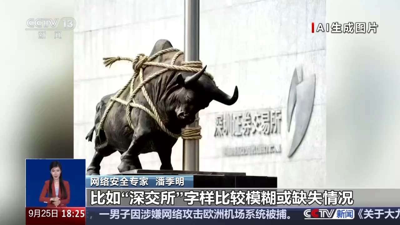 网络安全专家 潘季明:尽管AI生成的图片越来越逼真,但仍可以通过一些技术痕迹识别,如图像的细节异常,包括光影不一致,光源方向和阴影长度不符合物理规律。AI生成的图片可能会出现纹理模糊或重复的现象,如水面、云层、树叶等区域出现油画感较重或重复纹理等现象,此外,还有类似文字错乱的情况,如下图中“深圳证券交易所”字样较模糊或缺失。