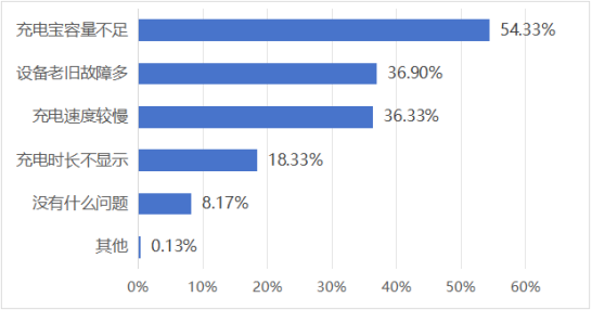 关于共享充电宝的使用情况,54.33%的受访者认为充电宝容量不足,36.90%的受访者认为设备老旧故障多,36.33%的受访者认为充电速度较慢。