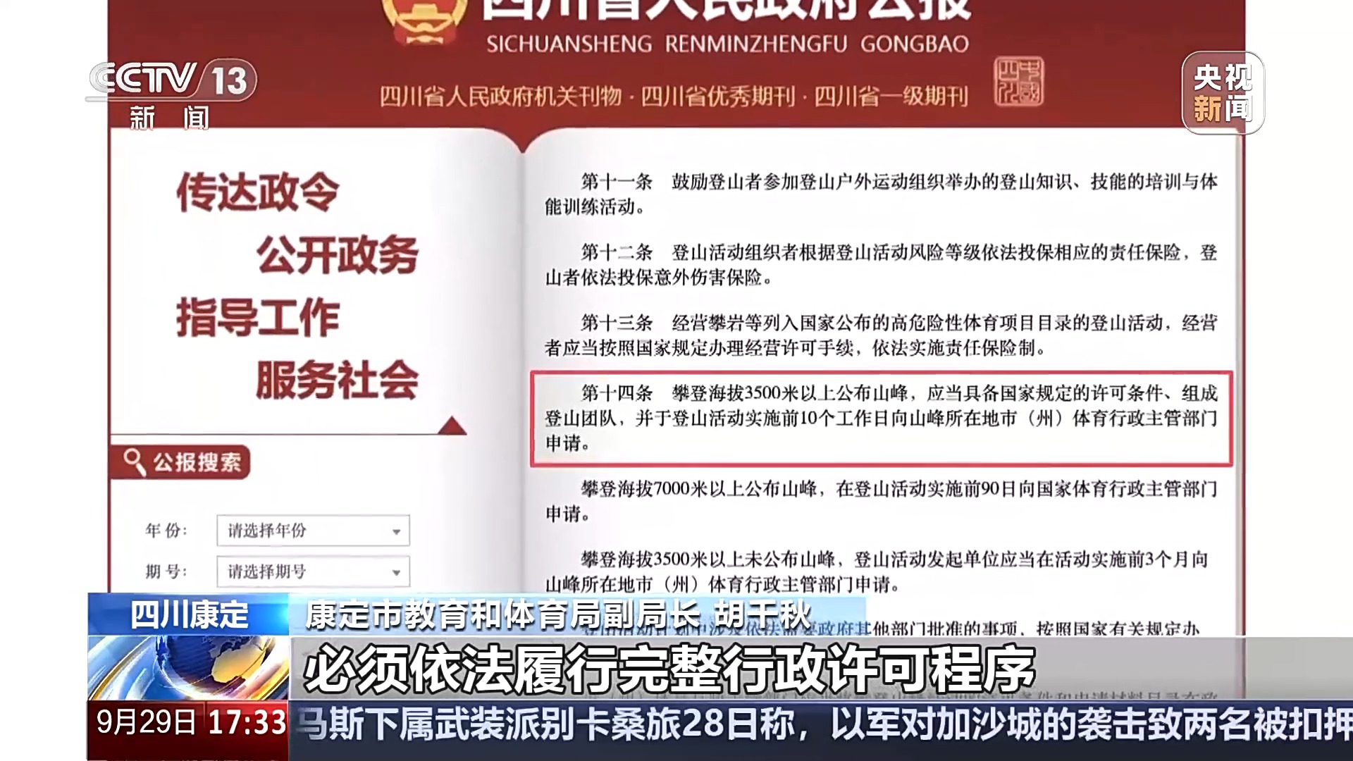 康定市教育和体育局副局长 胡千秋:本次事故明确属于违规登山行为,根据四川省登山管理办法规定,组织开展海拔3500米以上山峰的攀登活动,必须依法履行完整行政许可程序,我们在此呼吁所有登山爱好者,登山前务必做好万全准备,确保活动全程合理合法合规。