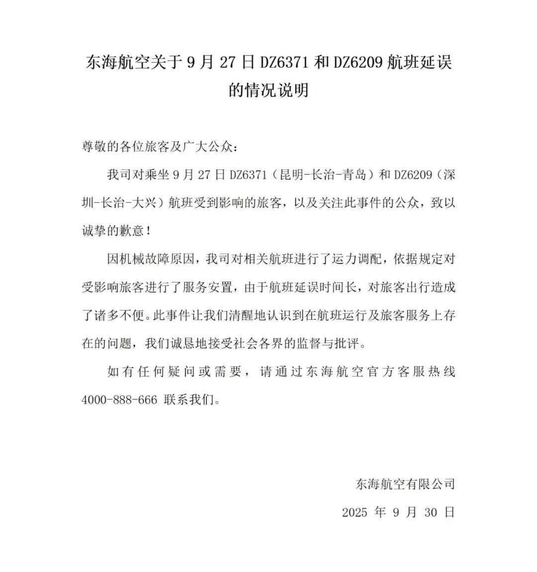 9月30日,东海航空关于9月27日DZ6371和DZ6209航班延误的情况说明: