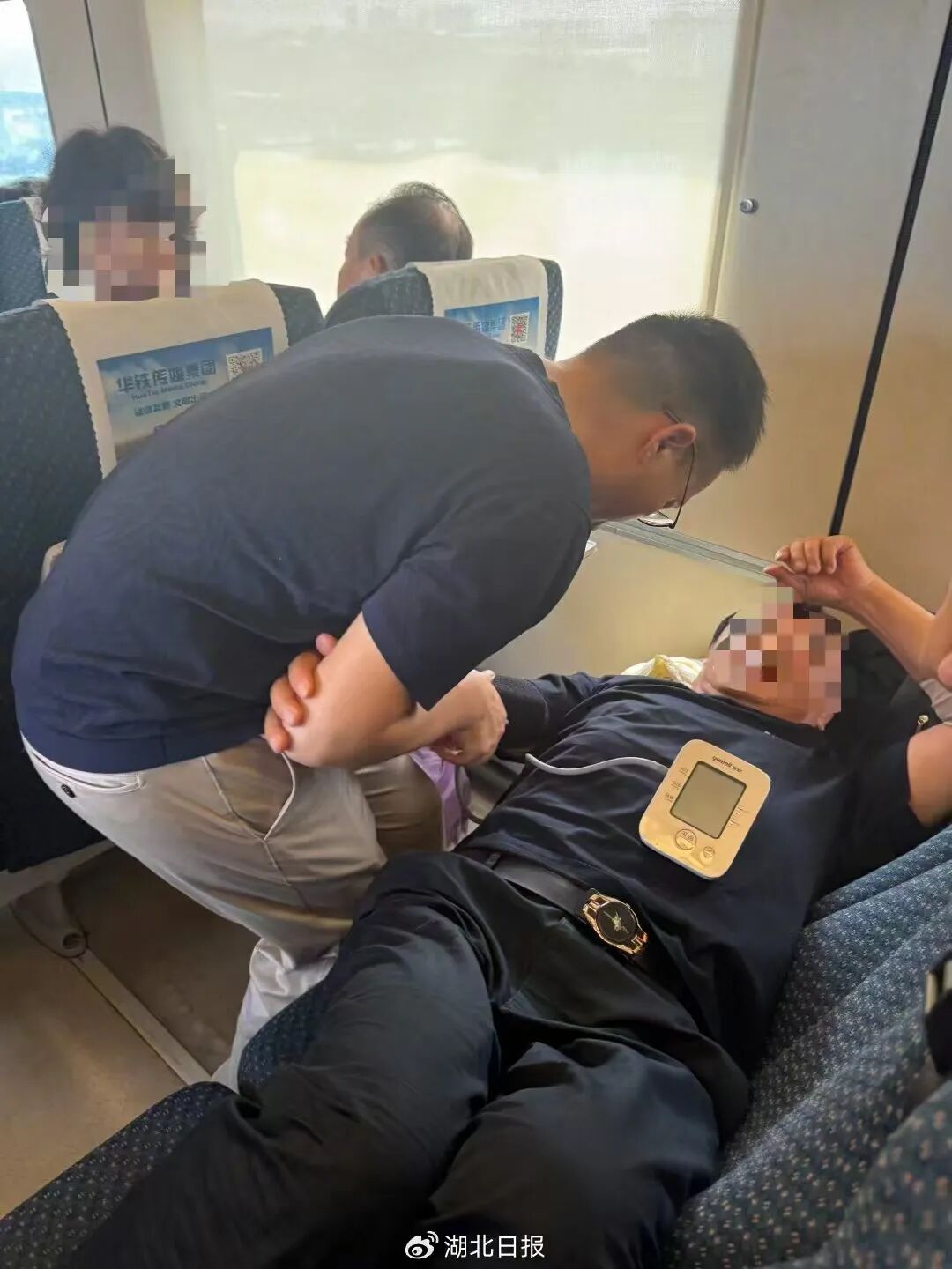 第一次处理稍微稳定之后,两人回到16号车厢不到5分钟,老人又不舒服,王强又赶到2号车厢,检测血压心率、指脉氧等。为确保后续治疗,黄任飞协助列车工作人员联系了就近的120,列车最终在汉口站临时停靠。