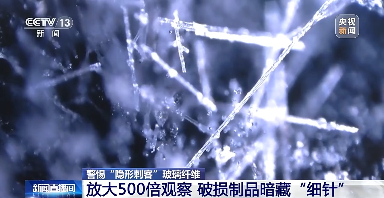玻璃纤维究竟长什么样?被破损的玻璃纤维制品扎到,肉眼看不见,让我们用显微镜将其放大500倍来仔细观察一下。
