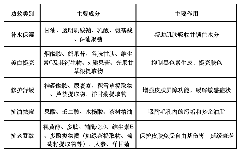 面膜成分可以分为基础成分和功能性成分,基础成分是大部分面膜都会添加的成分,功能性成分则是根据功效需求选择性添加的。